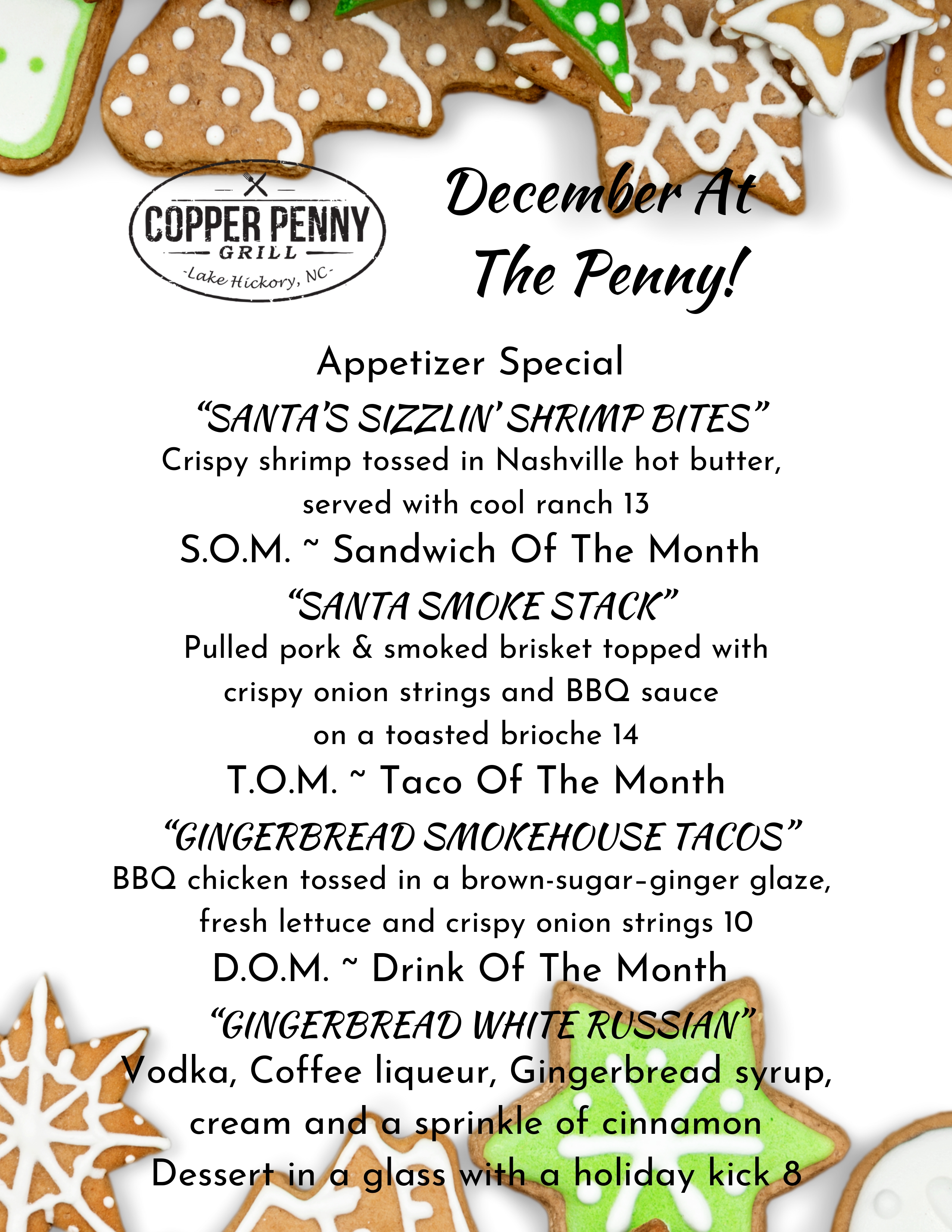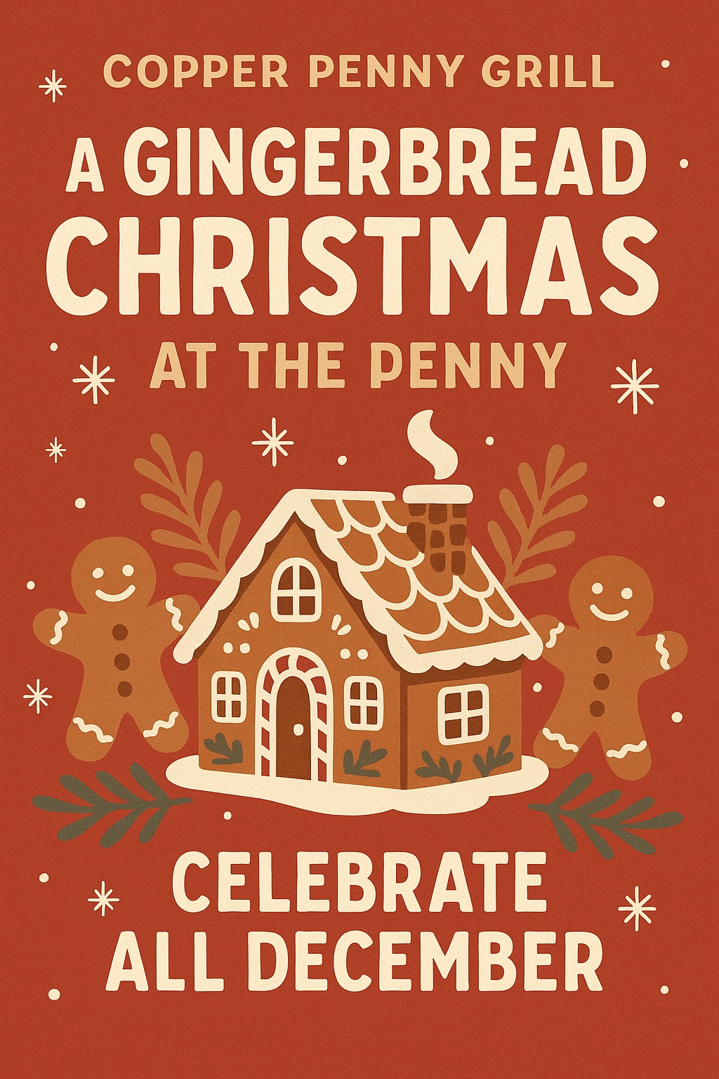 A Gingerbread Christmas is here all December long! Step into gingerbread-themed décor, snap a few sweet photos, and enjoy limited-time Christmas treats on the menu. We’re hosting festive, family-friendly events all month long—stay tuned for the schedule. Bring the whole crew and celebrate the sweetest season at Copper Penny Grill.