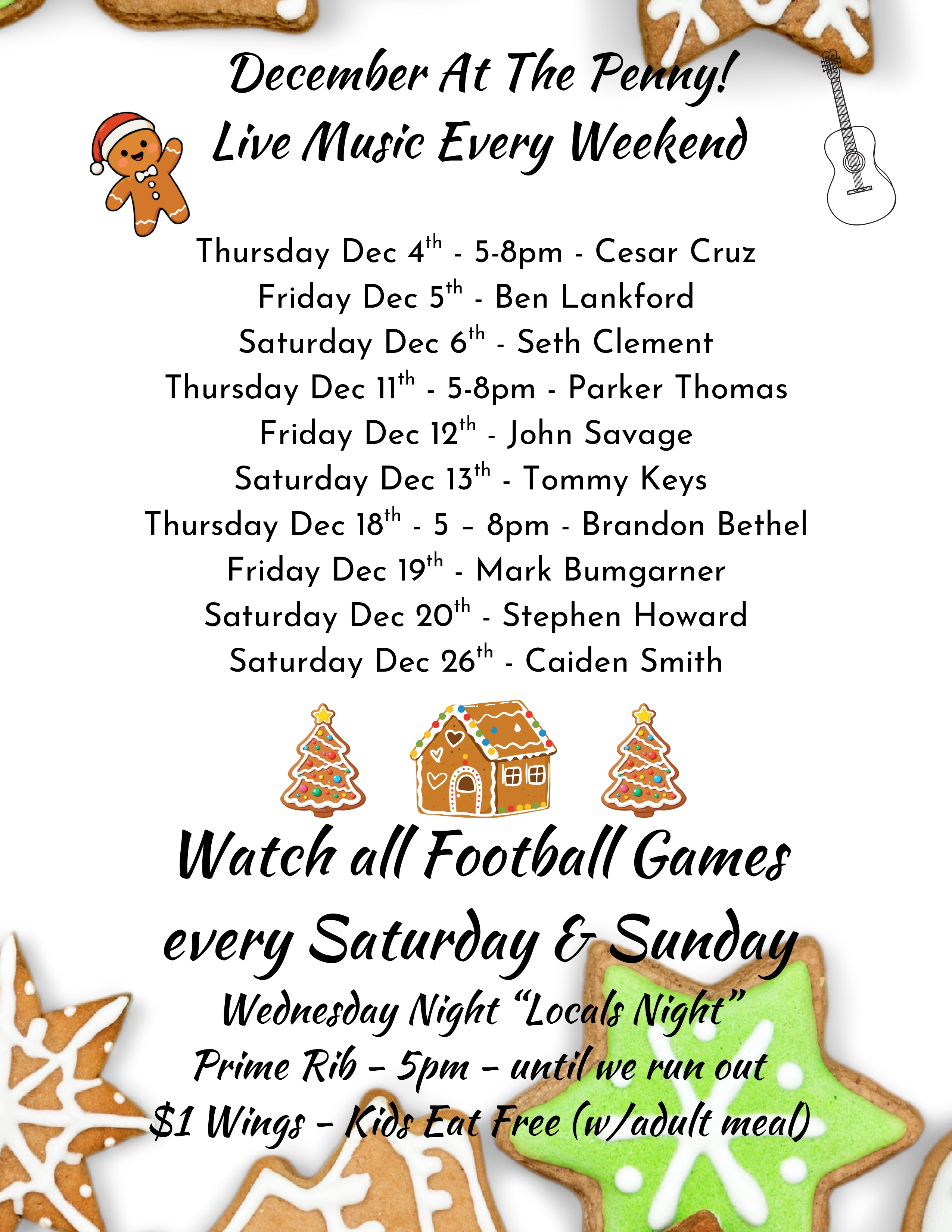 Gingerbread Christmas at The Penny is here all December! Step into gingerbread-themed décor, snap a few sweet photos, and enjoy limited-time Christmas treats on the menu. We’re hosting festive, family-friendly events all month long—stay tuned for the schedule. Bring the whole crew and celebrate the sweetest season at Copper Penny Grill.