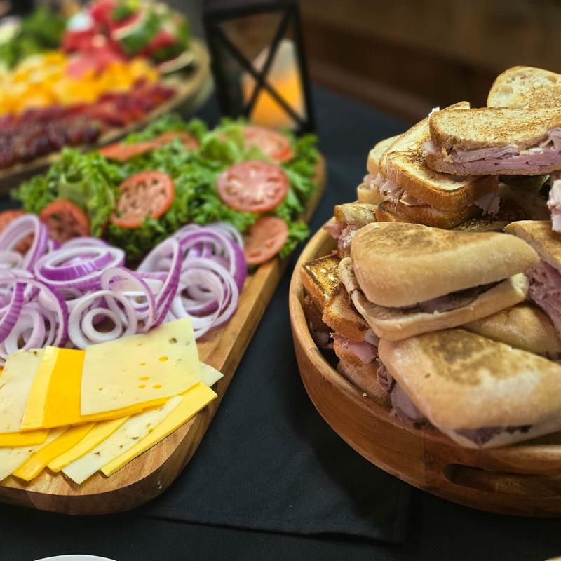 Vegetable, fruit, and cheese display | Spinach dip with tortilla chips | assorted wraps: ham, turkey, and roast beef* | House salad: served with ranch and balsamic vinaigrette | Homemade bacon ranch potato salad.
